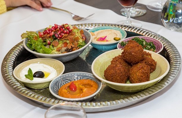 - mit Falafel & Fladenbrot Hummus, Auberginenpüree, Muhammara, Frischkäse, Falafel , Fattoushsalat, Taboulé